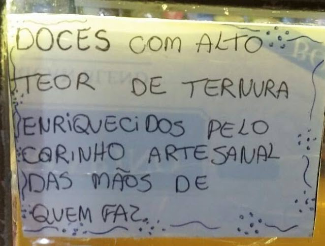 É tão pitoresco e gostoso o lugar, que ao entrar dentro, não dá vontade de sair mais. Ficar na venda, ouvindo as histórias dos fregueses, que entram e que saem, proseando e ouvindo as prosas, vendo as pessoas comprarem café moído na hora e cerais no quilo, embrulhado em papel e levarem para casa miudezas. Isso nos dá um sentimento de nostalgia, de estarmos voltando no tempo. (na foto acima do Judson Nani, um criativo aviso, onde ficam os doces e abaixo, um souvenir com lembrança da Mercearia Paraopeba)