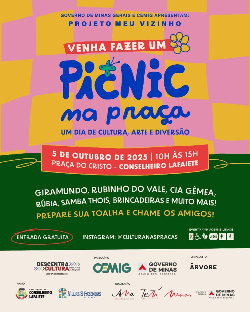O Picnic na Praça tem o patrocínio da Cemig, via Lei Estadual de Incentivo à Cultura. Um projeto Árvore. Apoio da Prefeitura de Conselheiro Lafaiete e do Circuito Villas e Fazendas. A realização é da Secretaria de Cultura e Turismo do Governo de Minas Gerais.
