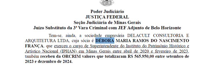 Segundo o documento, um processo no Iphan, que trata da regularização da planta de beneficiamento de minério de ferro da Fleurs Global, foi iniciada por Débora França e contrariou pareceres técnicos que indicaram que o empreendimento foi instalado na área do sítio arqueológico, além de estar sem os estudos de impacto exigidos pelo órgão federal.