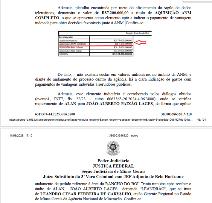 “Enquanto o primeiro período limitava-se ao favorecimento da EMPABRA, as investigações posteriores revelam atuação criminosa simultânea em múltiplos empreendimentos de grande porte: Projeto Taquaril envolvendo MMF e PRISMA MINERAÇÃO, Projeto Rancho do Boi avaliado em 1 bilhão de reais, Projeto HG Mineração, Projeto AIGA Mineração com rejeitos avaliados em 200 milhões e Projeto Patrimônio Mineração“, destaca o despacho da juíza.