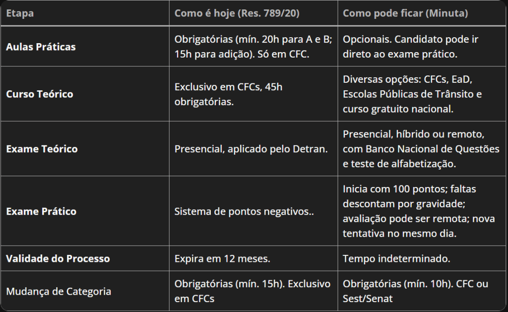 A Resolução nº 789/2020, do Contran, é a norma atualmente em vigor e consolida as regras sobre o processo de obtenção da Carteira Nacional de Habilitação (CNH). Já a nova minuta, se aprovada, promete, de acordo com o Governo Federal, maior flexibilidade, desburocratização e redução de custos para os candidatos.