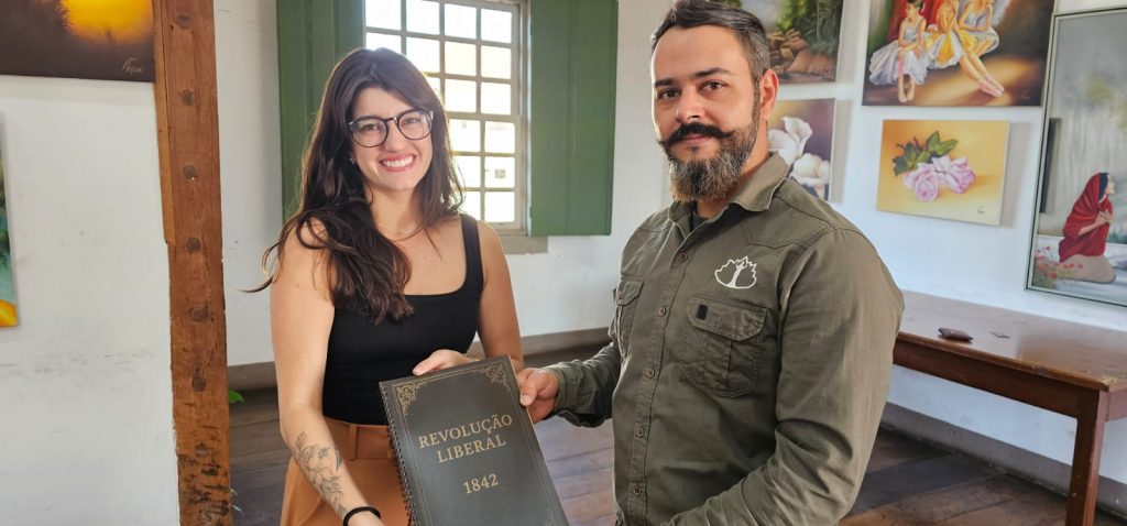 foto credito Artcool:  escultor piranguense. Felipe Rodrigues entregando um trabalho da Artcool sobre a Revolução Liberal de 1842 em Queluz à arquiteta gerente de cultura da SECULT.