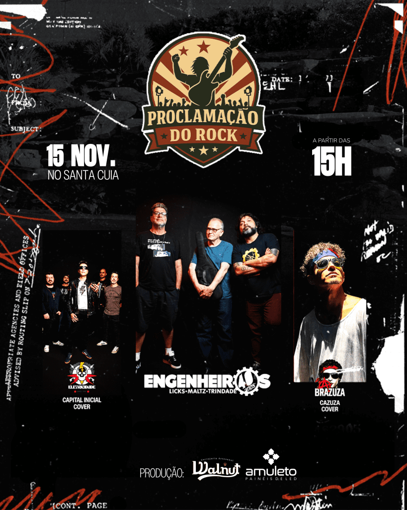 Dia 15 de novembro: o feriado da Proclamação da República vai soar diferente em Conselheiro Lafaiete. Chega o Proclamação do Rock, um festival que vem para celebrar o rock nacional com alma, energia e muita história pra contar. A partir das 15h, o Santa Cuia se transforma em ponto de encontro de gerações, lembranças e paixões. No som, três atrações que dispensam apresentações: Engenheiros (Licks–Maltz–Trindade), Eletricidade (cover de Capital Inicial) e Brazuca (cover de Cazuza). Clássicos que moldaram a identidade do rock brasileiro voltam a ecoar com força e emoção.