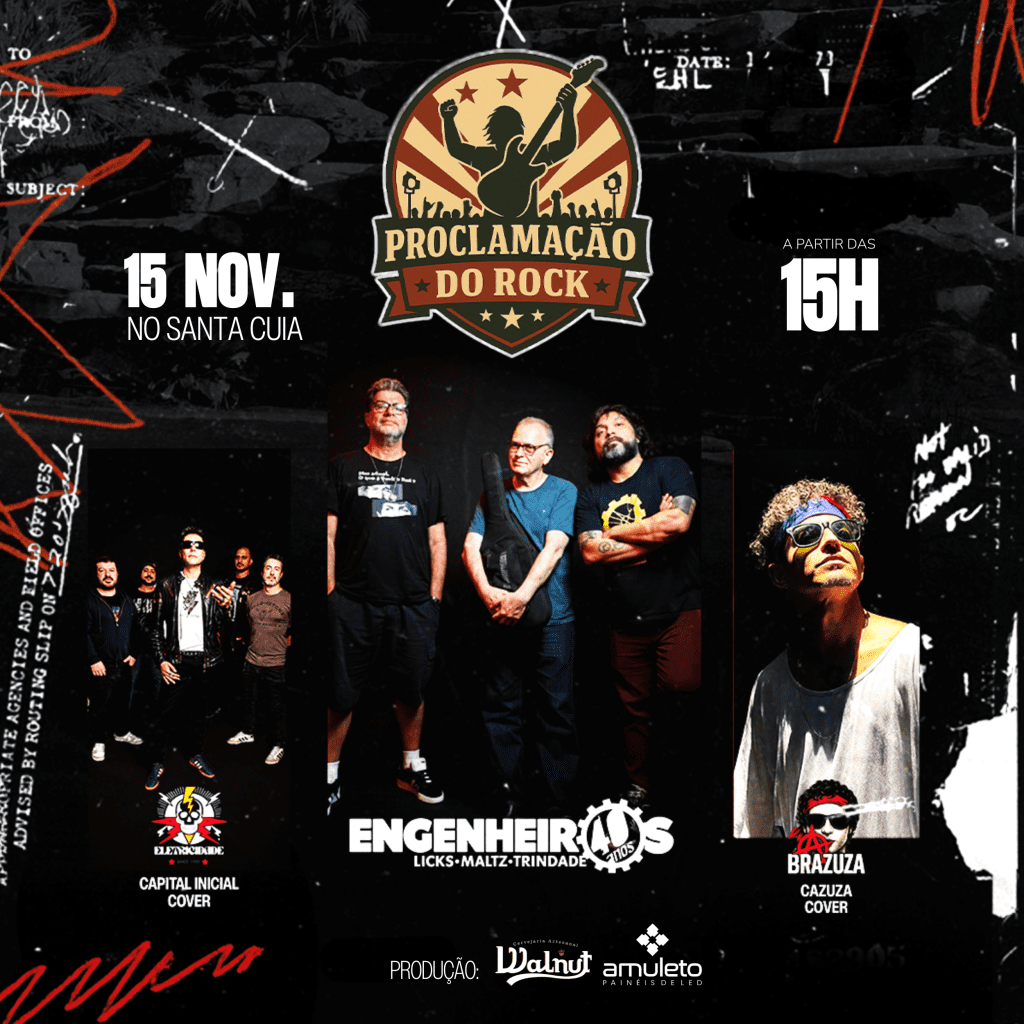 Dia 15 de novembro: o feriado da Proclamação da República vai soar diferente em Conselheiro Lafaiete. Chega o Proclamação do Rock, um festival que vem para celebrar o rock nacional com alma, energia e muita história pra contar. A partir das 15h, o Santa Cuia se transforma em ponto de encontro de gerações, lembranças e paixões. No som, três atrações que dispensam apresentações: Engenheiros (Licks–Maltz–Trindade), Eletricidade (cover de Capital Inicial) e Brazuca (cover de Cazuza). Clássicos que moldaram a identidade do rock brasileiro voltam a ecoar com força e emoção.
