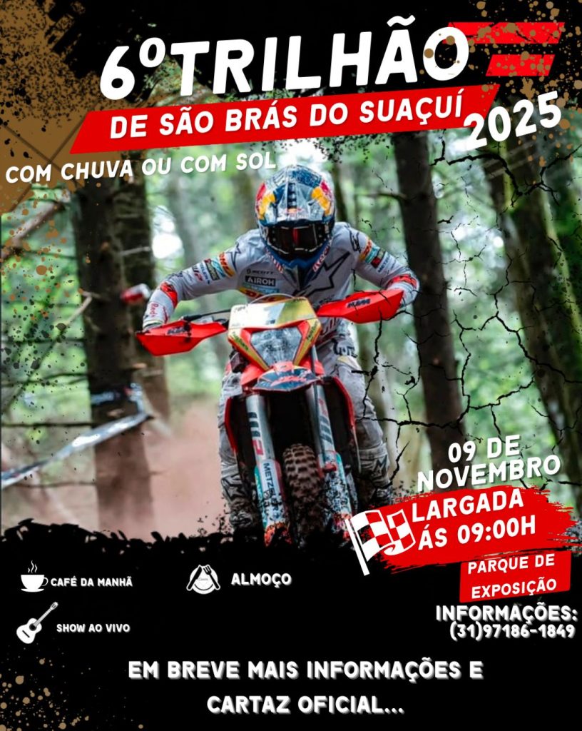 Com chuva ou com sol, o ronco dos motores vai ecoar pelos morros e trilhas de São Brás do Suaçuí. No dia 9 de novembro, a cidade se transforma no ponto de encontro dos apaixonados por aventura com a realização do 6º Trilhão, um dos eventos mais esperados pelos trilheiros da região.