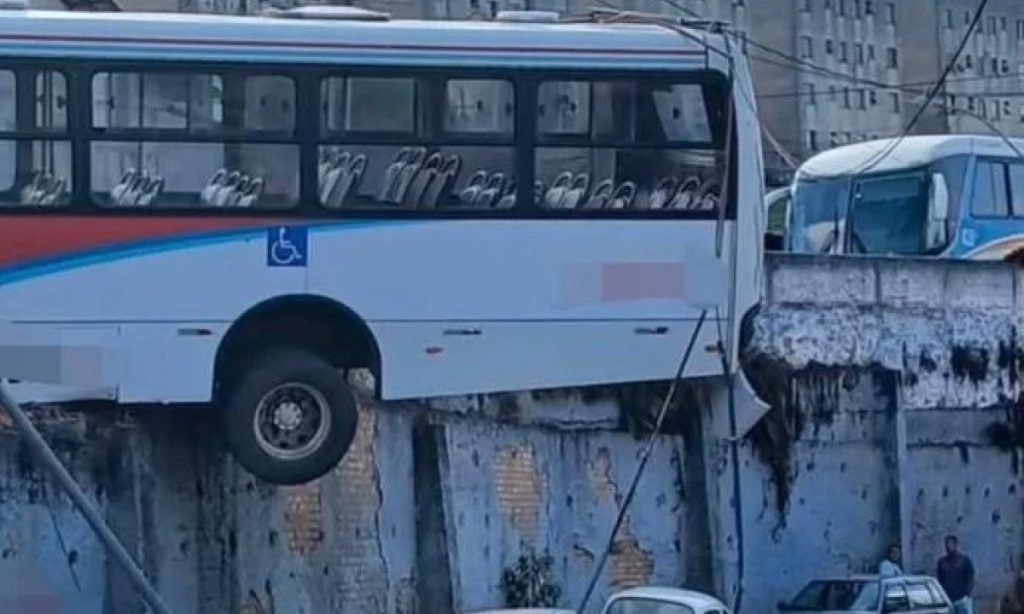 Um ônibus ficou pendurado no muro da garagem de uma empresa de transporte coletivo em Barbacena (MG), no Campo das Vertentes, nessa quarta-feira (15/10).
