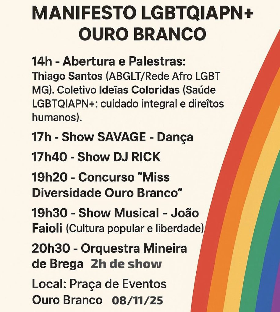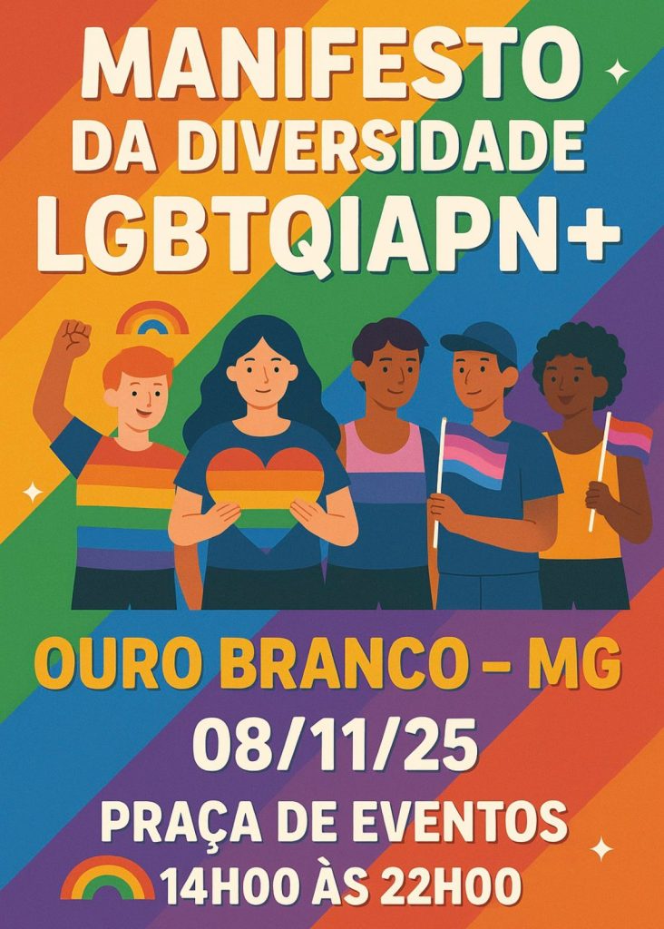 Sábado, dia 8 de novembro de 2025, a cidade de Ouro Branco (MG) será palco de um dos eventos mais importantes em defesa da diversidade, do respeito e da inclusão: o Manifesto LGBTQIAPN+. O encontro acontecerá na Praça de Eventos, das 14h às 22h, com uma programação repleta de cultura, debates, música e celebração da liberdade de ser quem se é.