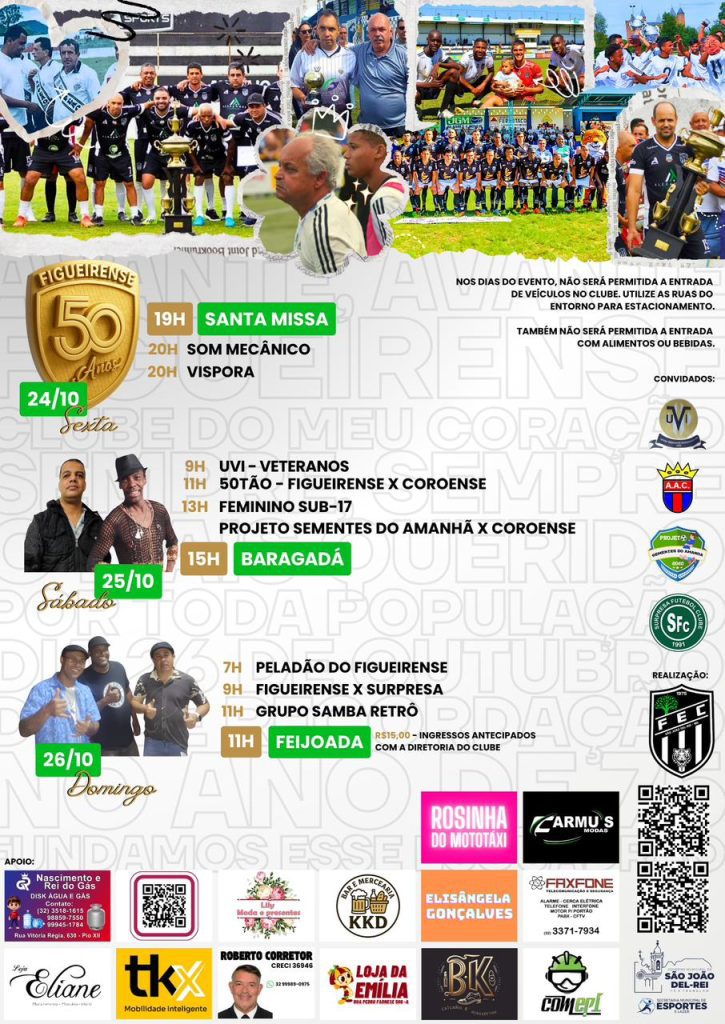São João del-Rei vai respirar história, tradição e paixão alvinegra neste fim de semana. O Figueirense Esporte Clube celebra seus 50 anos com uma programação que mistura fé, futebol e samba, em uma homenagem vibrante à trajetória de um dos times mais queridos da cidade. A festa começa na sexta-feira, dia 24 de outubro, com uma Santa Missa às 19h, reunindo torcedores, ex-jogadores e dirigentes que ajudaram a construir meio século de conquistas. À noite, a música toma conta com som mecânico e show da banda Vispora, abrindo as comemorações em clima de alegria.