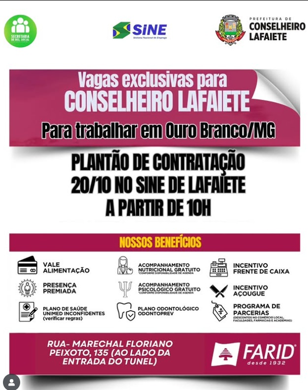 O Supermercado Farid, uma das maiores redes do setor de alimentos e serviços da região, realizará um plantão de contratações nesta segunda-feira, 20 de outubro, no SINE de Conselheiro Lafaiete, a partir das 10h. As vagas são exclusivas para moradores de Conselheiro Lafaiete, com oportunidades para trabalhar na nova unidade do Farid em Ouro Branco (MG).