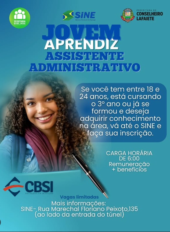 A empresa CBSI, em parceria com o SINE de Conselheiro Lafaiete, está com inscrições abertas para o programa Jovem Aprendiz – Assistente Administrativo! 💼✨