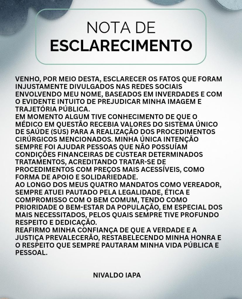 Nos últimos dias, a sentença dominou as rodas de conversas e os bastidores políticos da cidade. O vereador Nivaldo Iapa divulgou uma nota de esclarecimento em resposta a informações que, segundo ele, foram “injustamente divulgadas nas redes sociais” com o objetivo de prejudicar sua imagem e trajetória. No comunicado, Iapa aborda alegações envolvendo a realização de procedimentos cirúrgicos. O cerne de sua defesa reside na falta de conhecimento sobre o suposto uso indevido de recursos públicos.