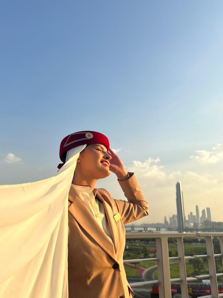 A jornada até a Emirates foi longa e exigente. Sharon tentou o processo seletivo quatro vezes até ser aprovada. “O processo tem cinco etapas, todas eliminatórias. Enviamos o currículo, o vídeo de apresentação, depois vem o screening day e o assessment day, que são bem intensos e cansativos. No final, há a entrevista, que pode ser online ou presencial. Passei na vez em que fiz presencialmente, acho que pude me expressar melhor pessoalmente.”