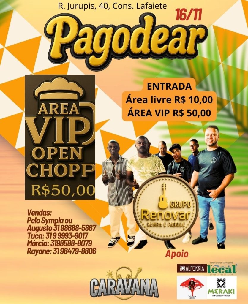 O ritmo contagiante do samba e do pagode vai tomar conta de Conselheiro Lafaiete no dia 16 de novembro, com a chegada do evento “Pagodear”, que promete reunir amigos, boa música e muita energia positiva na Rua Jurupis, nº 40. O destaque da noite será o Grupo Renovar, conhecido por sua autenticidade e por manter viva a essência do samba e do pagode raiz. Com um repertório vibrante e cheio de sucessos, o grupo promete transformar o evento em uma verdadeira celebração da cultura popular brasileira.