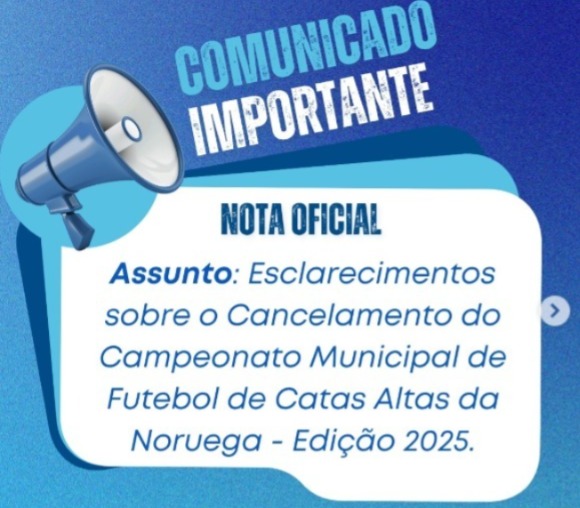 A Administração Municipal de Catas Altas da Noruega, pautada nos princípios da legalidade, ética, transparência e no respeito à comunidade e aos desportistas, vem a público para prestar os devidos esclarecimentos acerca do cancelamento do Campeonato Municipal de Futebol – Edição 2025. O certame desportivo teve seu início em julho de 2025, com a participação expressiva das equipes locais. No entanto, após a realização de três rodadas, a empresa inicialmente contratada, por meio de processo licitatório, para a organização e condução do Campeonato, formalizou um pedido de rescisão contratual, após necessidade de julgamentos e decisões.