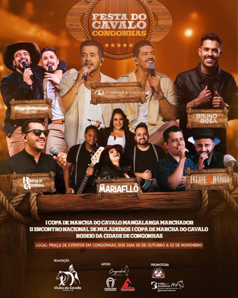 A adrenalina também está garantida com o Rodeio da Cidade de Congonhas, que ocorre todas as noites, atraindo participantes e público interessado nas provas e nas tradições da atividade rural. A festa ainda terá shows com artistas como Diogo & Hernani, Henrique & Diego, Bruno Rosa, Ramon Gomes, Maria Flô e Felipe & Nando, garantindo diversão e entretenimento para o público.Segundo Frederico Augusto Paiva, tesoureiro do Clube do Cavalo de Congonhas, “o apoio da Prefeitura é essencial para a realização do nosso evento. A parceria permite que a Festa do Cavalo cresça a cada edição, e estamos muito animados para entregar um evento ainda mais especial, não só para Congonhas, mas para toda a região”.