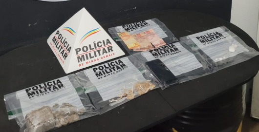 Durante a abordagem, foram encontradas 01 bucha de maconha, 04 pedras de crack, 05 invólucros de cocaína, um celular e R$ 50,00 em dinheiro.