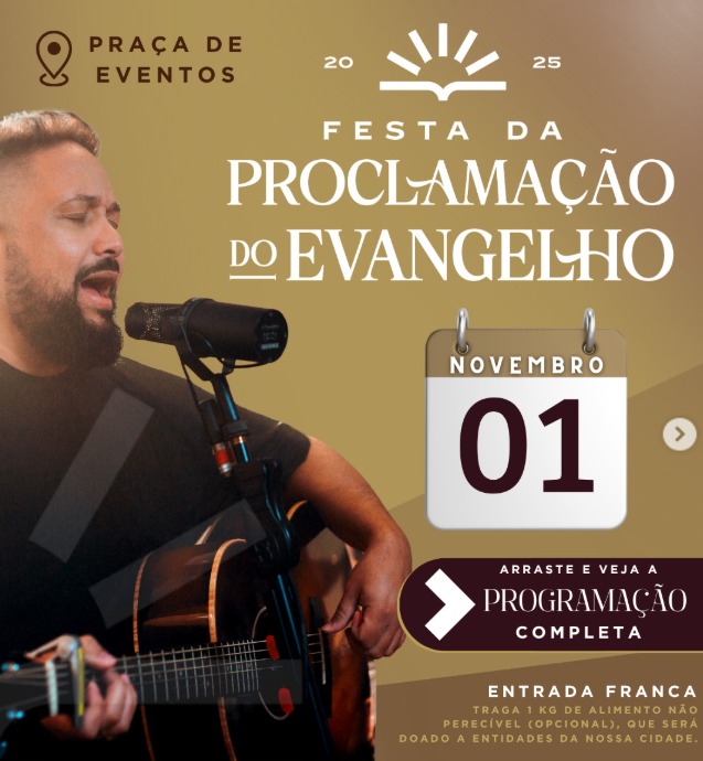 A cidade de Ouro Branco se prepara para viver um dia inesquecível de fé, música e solidariedade com a realização da Festa da Proclamação do Evangelho 2025, neste sábado, 1º de novembro, na Praça de Eventos. Com entrada gratuita, o evento é promovido pela Prefeitura Municipal de Ouro Branco, por meio da Secretaria de Desenvolvimento Social, e promete uma programação intensa e emocionante ao longo de todo o dia.