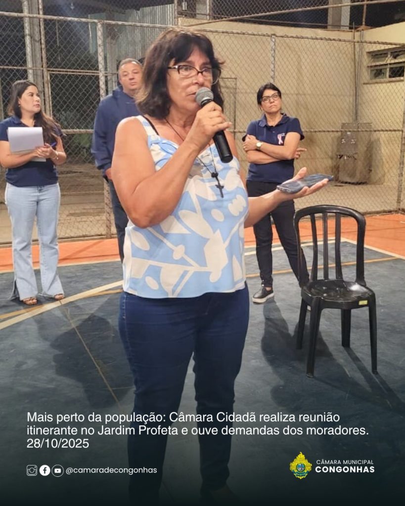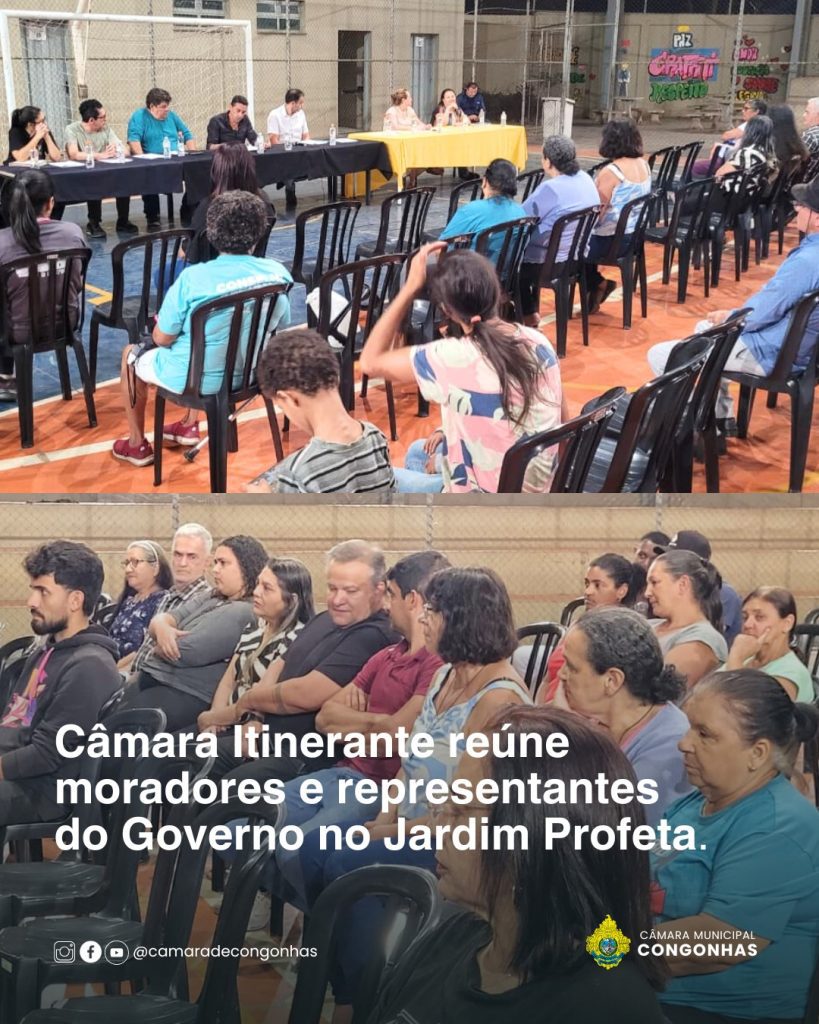 A Câmara Itinerante realizou, na terça-feira (28), mais uma edição do projeto, desta vez no bairro Jardim Profeta. O encontro aconteceu na Escola Municipal Dom João Muniz e reuniu cerca de 27 moradores, além de representantes do Governo Municipal, para discutir demandas e propostas de melhorias para a comunidade. Os moradores destacaram problemas antigos de limpeza e urbanização, principalmente na entrada do bairro, que é o principal acesso à cidade pela BR-040. O representante da Secretaria de Meio Ambiente informou que o Projeto PurificAR, já implantado no bairro Pires, também beneficiará o Jardim Profeta, com ações para redução da poeira e melhoria da qualidade do ar. O Secretário de Zeladoria Urbana relatou que mais de 900 toneladas de terra e barro já foram retiradas das vias de Congonhas neste ano.