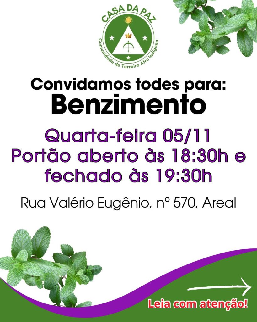 A programação completa e as próximas datas de benzimentos podem ser acompanhadas pelo Instagram @umbandacasadapaz, onde a comunidade compartilha orientações, reflexões e registros de suas atividades.