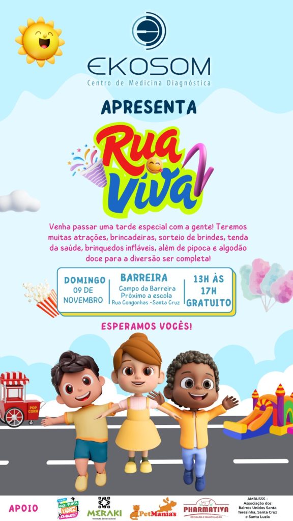 Os bairros Santa Terezinha, Santa Cruz e Santa Luzia se preparam para viver uma tarde de encontro, cultura e diversão com mais uma edição do Rua Viva, que acontece no domingo, 9 de novembro, no Campo da Barreira, próximo à escola da Rua Congonhas, das 13h às 17h.