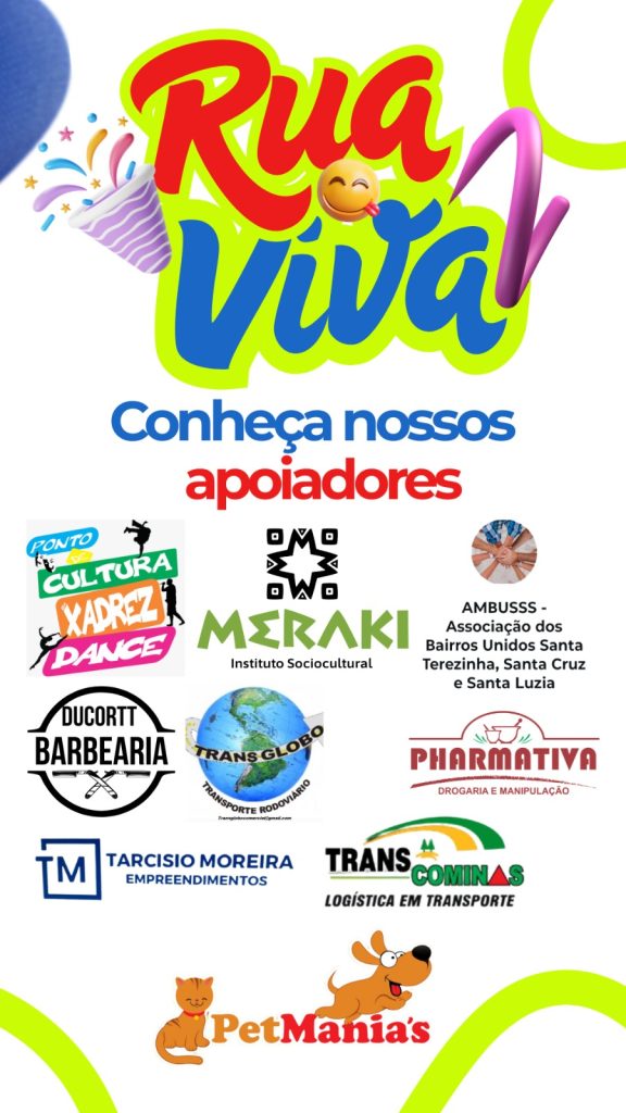 O Rua Viva é um projeto que celebra a união entre saúde, cultura e cidadania, levando lazer e bem-estar a diferentes comunidades de Lafaiete. A ação conta com o apoio da AMBUSSS – Associação dos Bairros Unidos Santa Terezinha, Santa Cruz e Santa Luzia, Ponto de Cultura Xadrez Dance, Instituto Meraki, Pet Manias e Pharmativa.