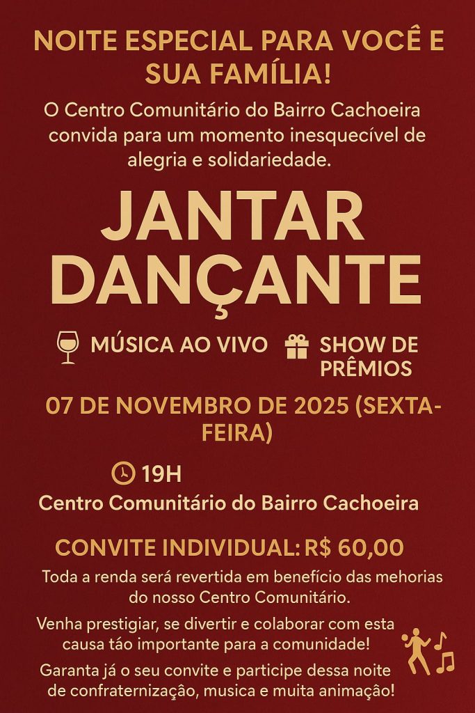 O Bairro Cachoeira está se mobilizando em torno de um propósito bonito: fortalecer laços e revitalizar o espaço que há décadas serve de ponto de encontro para seus moradores. A nova diretoria da Associação Comunitária dos Moradores do Bairro Cachoeira, cheia de energia e comprometimento, está organizando um jantar dançante beneficente no dia 7 de novembro, sexta-feira, a partir das 19h, na sede da associação, que fica na Rua José Martins Simões, 85.