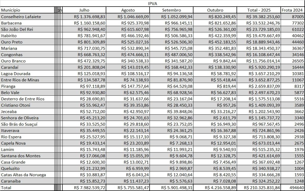A cidade de Lafaiete é disparada a mais que recebeu recursos do IPVA, uma bagatela milionários de R$39382 milhões, até outubro de 2025 Em seguida vem Barbacena (R$33.532 milhões), São João del Rei (R$23.729 milhões), Itabirito (R$19.479 milhões), Ouro Preto (R$18.889 milhões), Mariana (R$18.343 milhões), Congonhas (R$16.108 milhões e Ouro Branco com R$11.756 milhões. Confira a lista completa abaixo.