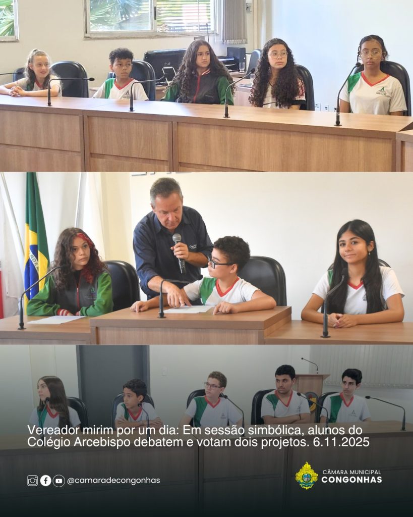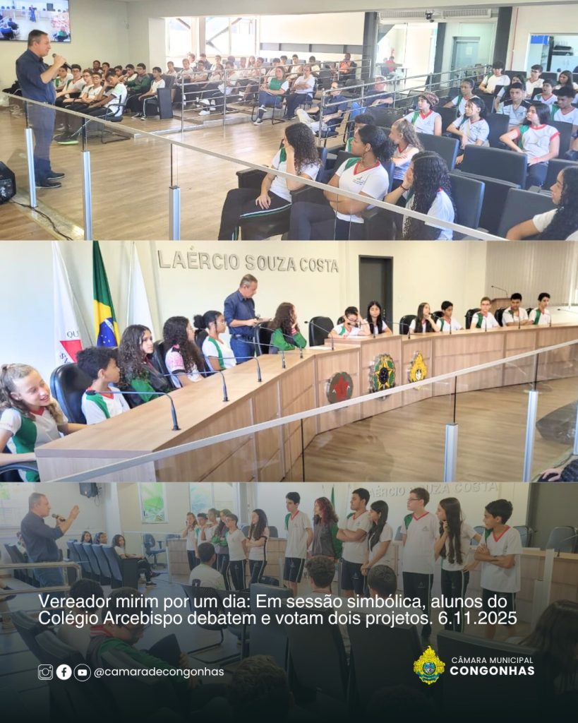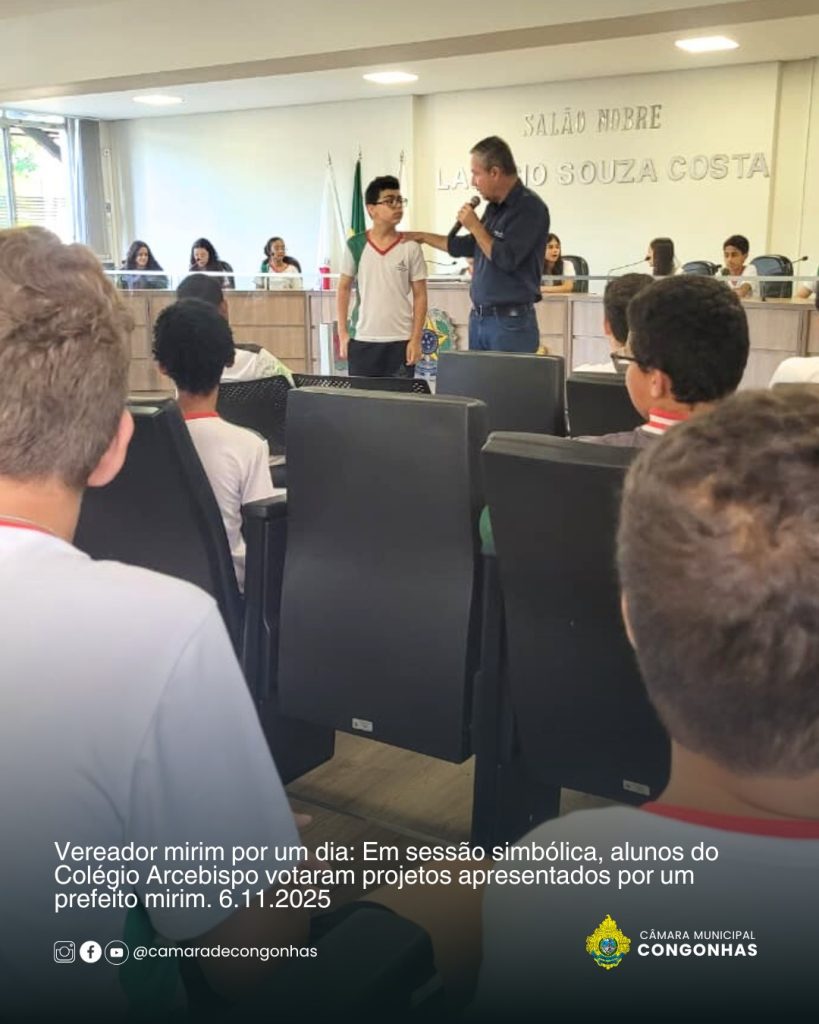 Nesta quinta-feira (06), alunos do Colégio Arcebispo Dom Oscar de Oliveira, participaram do programa “Vereador Mirim por um Dia”, promovido pela Escola do Legislativo da Câmara de Congonhas. A iniciativa tem como propósito despertar a consciência cívica, incentivar o interesse pelas decisões políticas e contribuir para a formação de futuros líderes e cidadãos conscientes.