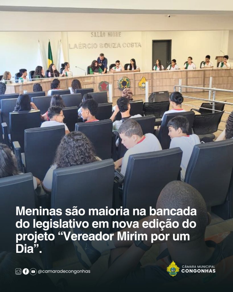 Criado em 1998, o programa Vereador Mirim por um Dia é voltado para estudantes de qualquer nível de ensino. Escolas públicas, privadas ou entidades legalmente instituídas em Congonhas que desejarem participar devem encaminhar solicitação à Mesa Diretora da Câmara com, no mínimo, 30 dias de antecedência ou através da Escola do Legislativo pelo telefone 3732-0300 (Ramal 226/227 Administração).