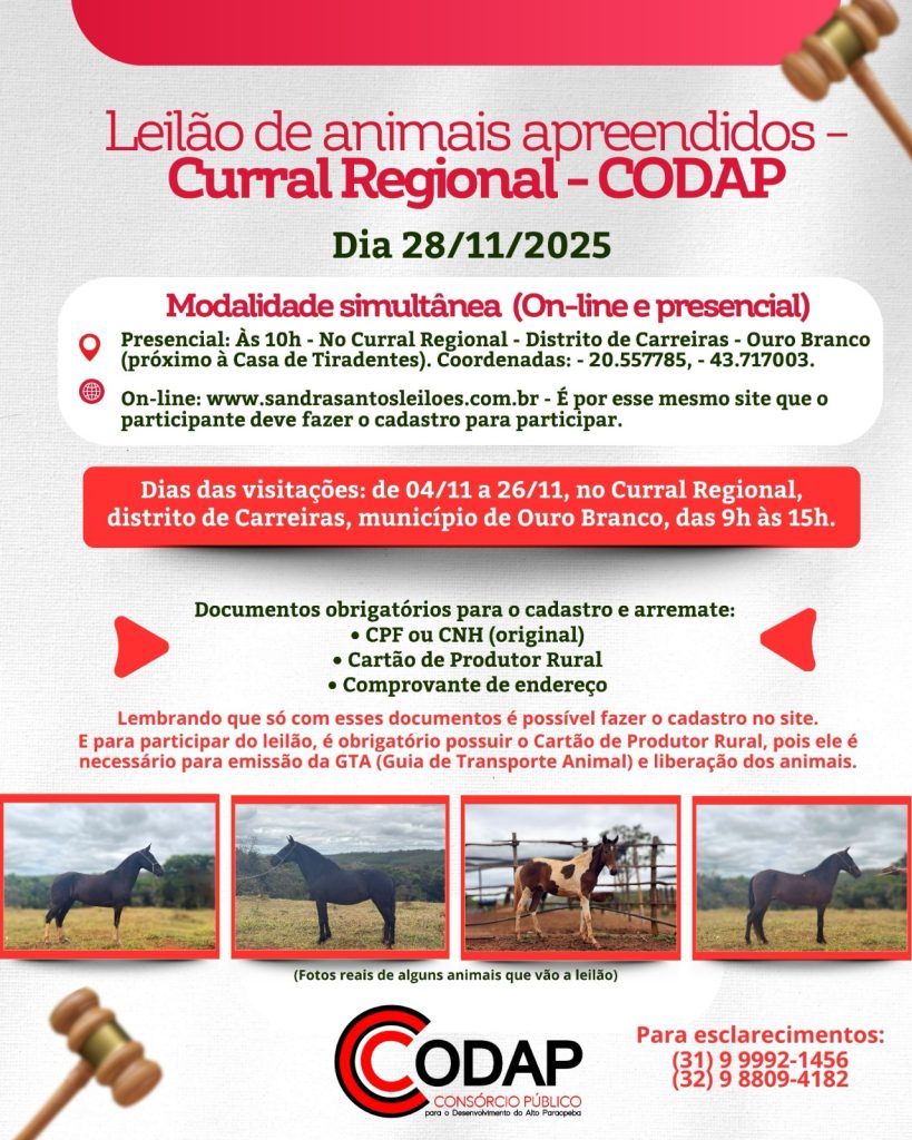 O CODAP realiza mais um Leilão de Animais Apreendidos que estão no Curral Regional, localizado no distrito de Carreiras, município de Ouro Branco/MG.