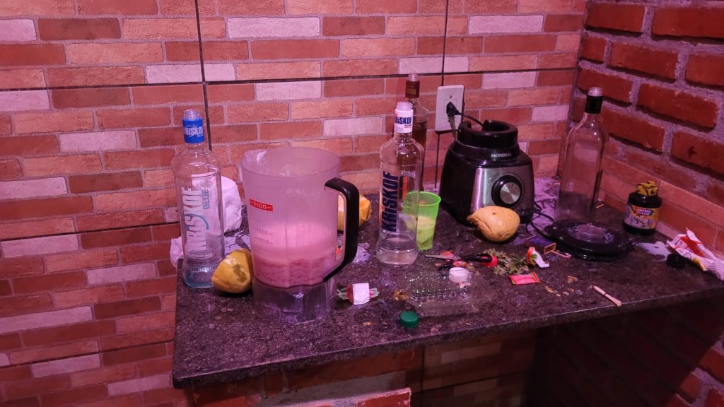 Ao perceberem a chegada da viatura, diversos jovens fugiram em direção a áreas de mata próximas. No imóvel, os militares encontraram copos e garrafas com bebidas de teor alcoólico, além de utensílios usados na preparação de drinques. No local, um jovem maior de idade e uma adolescente se apresentaram como responsáveis pela festa. O rapaz alegou que o evento havia sido organizado por um grupo de amigos em um grupo de mensagens e contou com a participação de vários organizadores, muitos deles menores de idade.