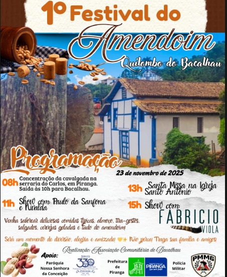 Prepare o chapéu e o bom humor, porque o distrito do Quilombo do Bacalhau, em Piranga, promete um dia inteiro de muita música, tradição e sabor! No próximo domingo, 23 de novembro de 2025, acontece o 1º Festival do Amendoim, um evento que mistura cultura, fé e diversão no coração das comunidades quilombolas da região. A festa começa cedo, às 8h, com a concentração da cavalgada na serraria do Carlos, em Piranga. Os cavaleiros seguem rumo ao Bacalhau, onde a alegria toma conta do povoado.