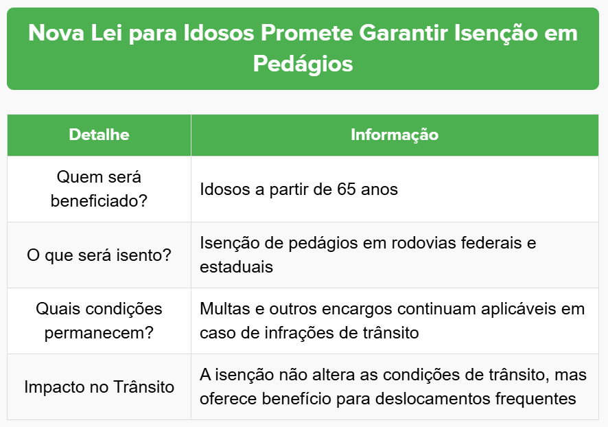 Uma nova lei, que segue sendo avaliada no Congresso Nacional, poderá isentar os idosos com idades a partir de 65 anos do pagamento de tarifas de pedágio em rodovias, representando uma grande mudança na política pública de benefícios para a terceira idade.