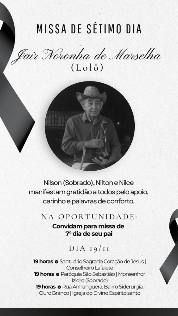 Os filhos Nilson (Sobrado), Nilton e Nilce agradecem as mensagens de carinho, as orações e o apoio recebido desde o falecimento, e convidam a todos para esse momento de fé, despedida e gratidão pela vida de Lolô. Que a memória de Jair Noronha de Marselha permaneça viva no coração de todos que partilharam sua caminhada.