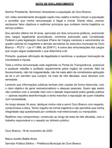 Com autorização, a vereadora leu uma nota oficial enviada pelo servidor. No texto, Marco Aurélio esclarece que exerce dois cargos legalmente acumuláveis, conforme a Constituição Federal e o PCCV municipal (Lei nº 1.868/2011). Ele reforça que toda sua remuneração é pública, auditada e acessível a qualquer cidadão. O servidor lamentou que informações oficiais tenham sido distorcidas para gerar sensacionalismo e ataques pessoais, afirmando que sua trajetória de 34 anos no serviço público sempre foi pautada por ética, responsabilidade e dedicação.