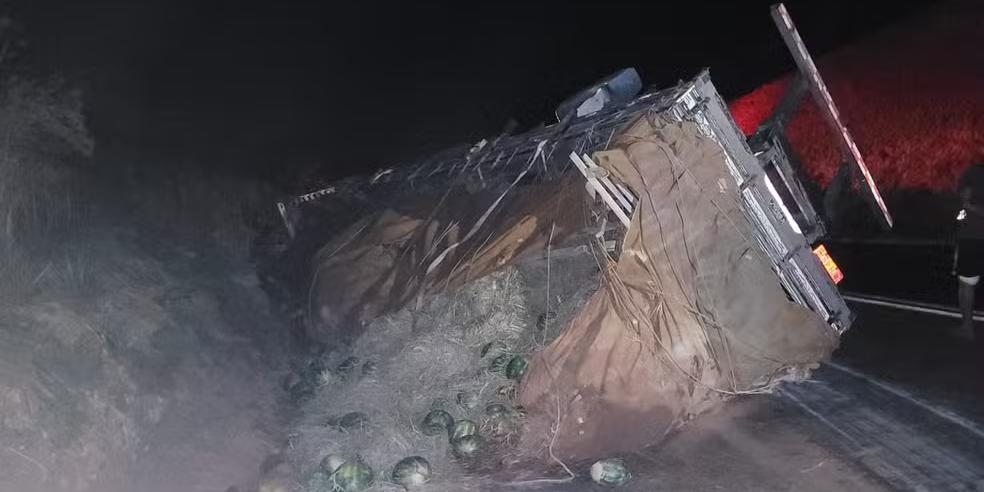 Um caminhão carregado com 14 toneladas de melancia tombou na BR-251, na Serra de Francisco Sá, na região Norte de Minas, na noite dessa quinta-feira (20).