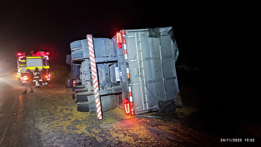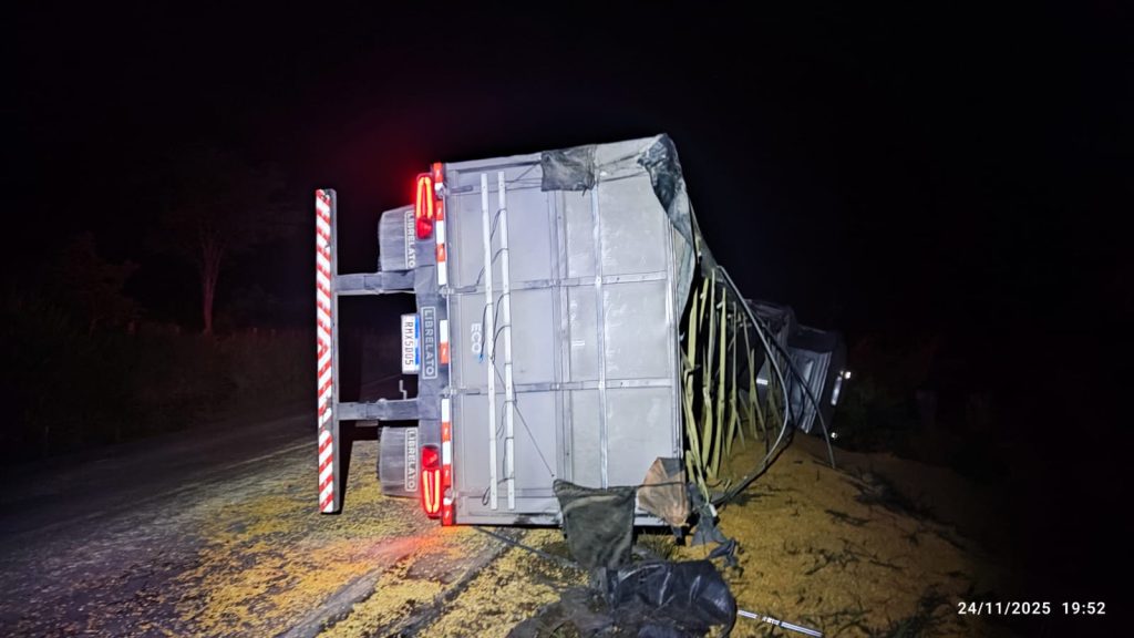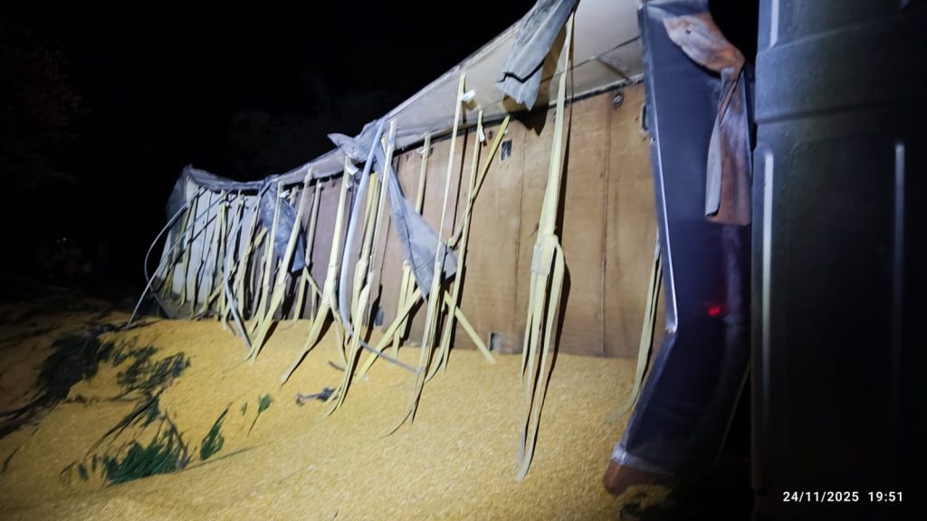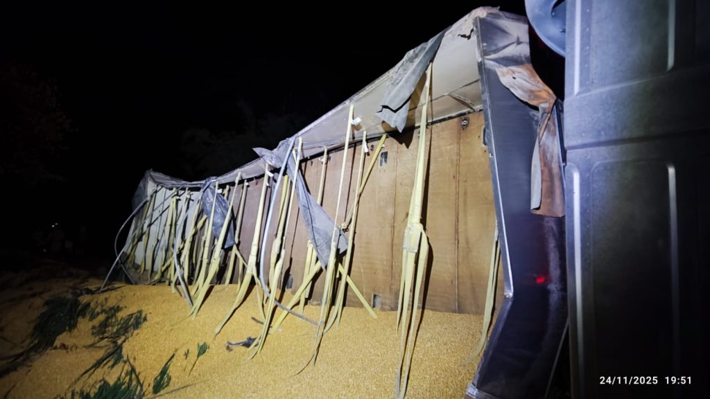 Na noite desta segunda-feira (24/11), por volta das 18h20, a Polícia Militar Rodoviária foi acionada para atender um grave acidente no km 131 da MGC-265, no município de Mercês (MG). O fato envolveu um conjunto veicular de carga que transportava milho. Segundo a guarnição, o semirreboque tombou sobre o acostamento e parte da pista, espalhando grande quantidade da carga pela via.