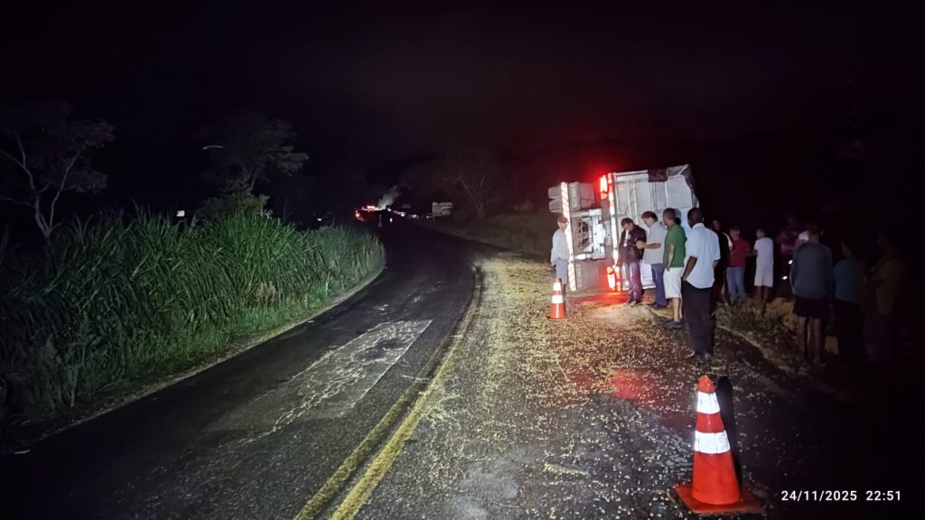 O condutor, de 64 anos, foi encontrado já sem vida, sendo o óbito confirmado pela equipe do SAMU. A Perícia Técnica da Polícia Civil realizou a liberação do local de forma remota. Em seguida, a funerária foi acionada e efetuou a remoção do corpo. A via precisou ser parcialmente interditada, exigindo controle do tráfego. Representantes da empresa proprietária do veículo estiveram no local com equipe própria, assumindo a custódia da carga e iniciando as tratativas para destombamento, remoção do material e limpeza da pista. A empresa destinatária da carga também foi mobilizada para recolher o milho derramado. A PMRv e o CBMMG atuaram no isolamento, segurança da área e orientação do trânsito durante toda a ocorrência.