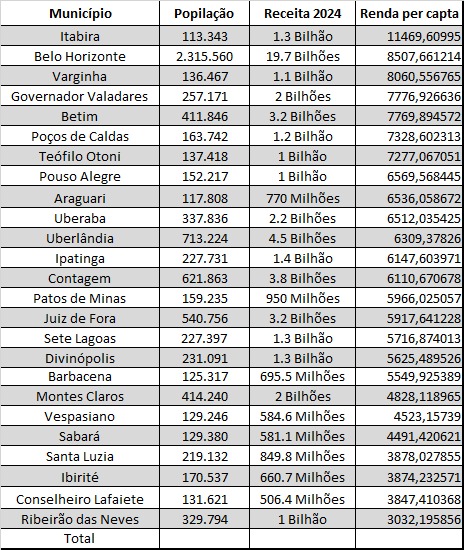 Os novos dados econômicos colocam Conselheiro Lafaiete em uma posição extremamente preocupante: mesmo sendo uma das 25 cidades mais populosas e importantes do estado, aparece com uma das menores renda per capita de Minas Gerais. Com R$ 3.847 por habitante, Lafaiete tem uma renda individual mais baixa que dezenas de cidades menores, menos estruturadas e com economia muito inferior.