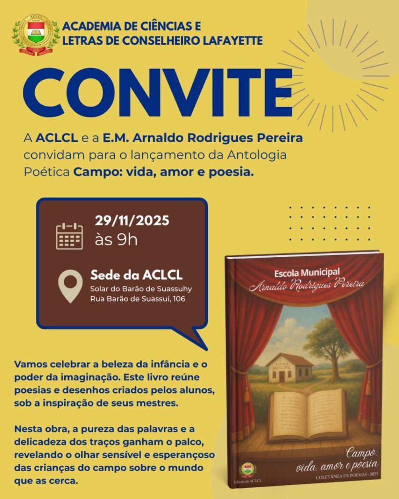A Academia de Ciências e Letras de Conselheiro Lafayette (ACLCL), em parceria com a Escola Municipal Arnaldo Rodrigues Pereira, tem a alegria de convidar você para um momento de celebração da arte, da sensibilidade e da imaginação das nossas crianças.