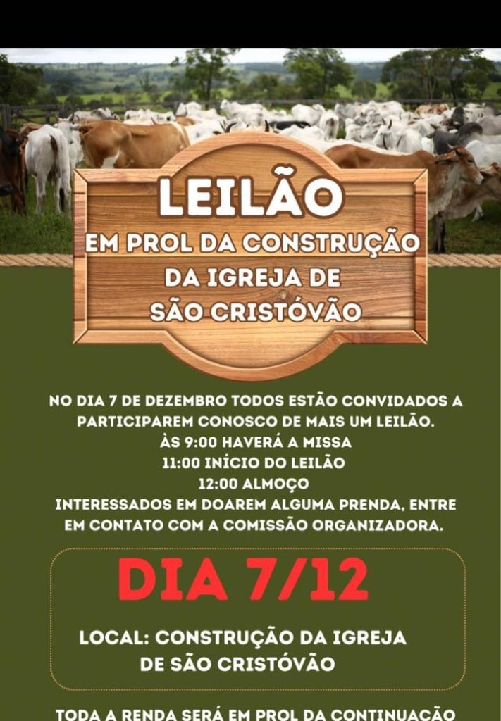 A comunidade de São Cristóvão realizará no próximo dia 7 de dezembro um leilão beneficente para arrecadar recursos destinados à continuidade da construção da Igreja de São Cristóvão, em Lafaiete. Moradores e apoiadores da obra estão convidados a participar do evento, que contará com programação religiosa, almoço e o tradicional leilão de prendas.