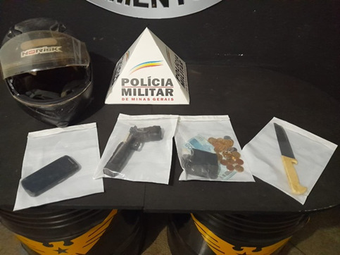 Com o suspeito, os policiais apreenderam um simulacro de arma de fogo e o capacete usado no assalto. Dentro do veículo foram encontradas uma faca, um celular e uma sacola contendo a exata quantia levada do estabelecimento. Identificado e já conhecido por possuir antecedente por tráfico de drogas, o homem confessou o roubo. Ele foi preso em flagrante e encaminhado à Delegacia de Polícia Civil. A caminhonete utilizada na ação foi apreendida e removida ao pátio credenciado, onde foi constatado que se tratava de um veículo furtado no município de Congonhas. A Polícia Militar reforçou que seguirá intensificando o patrulhamento na região para coibir novos crimes.