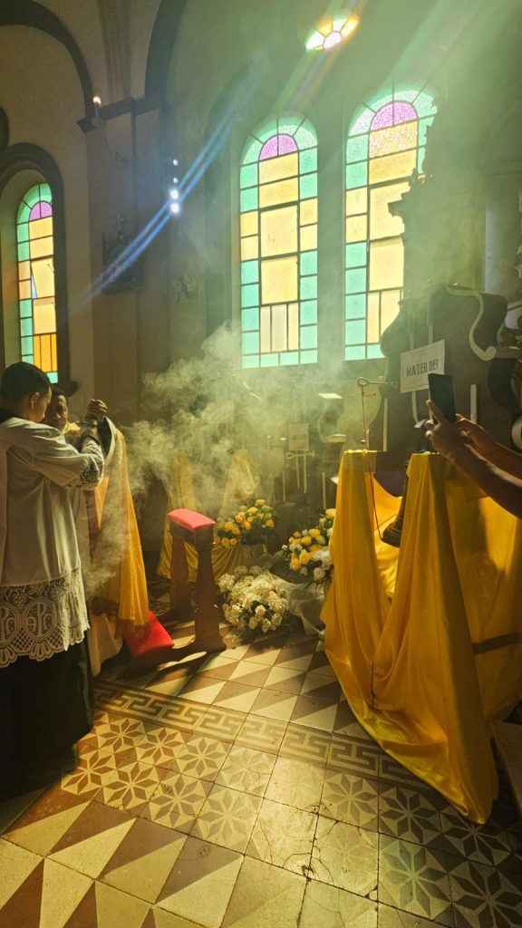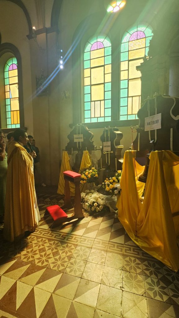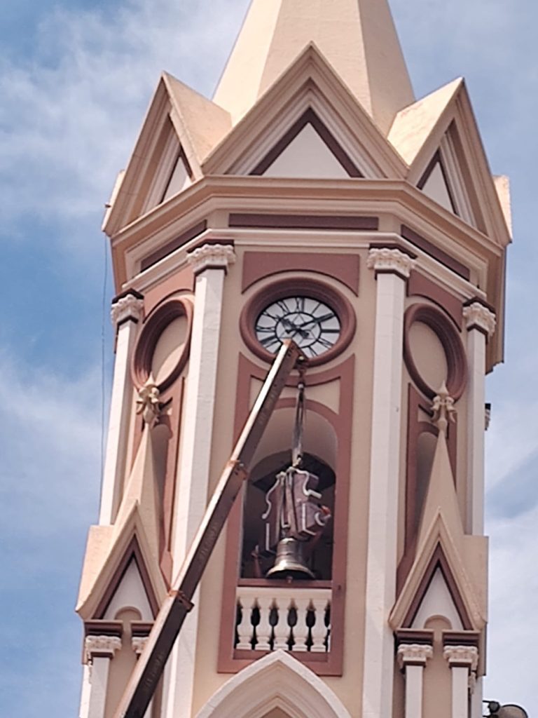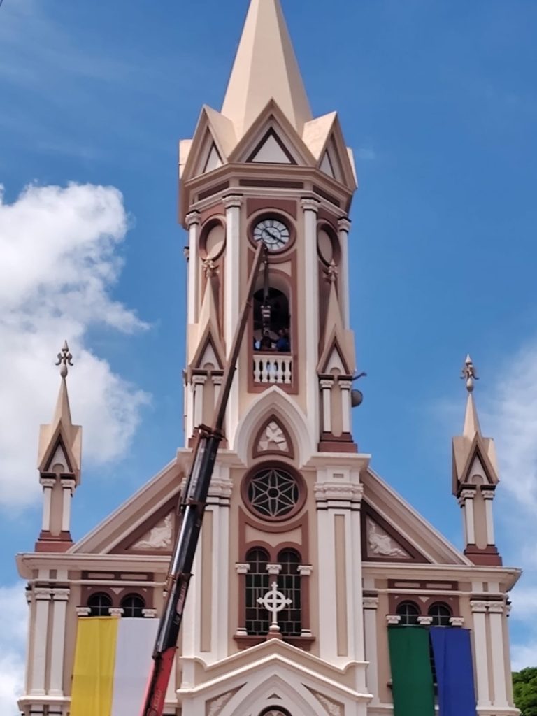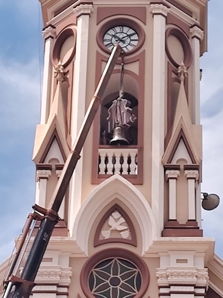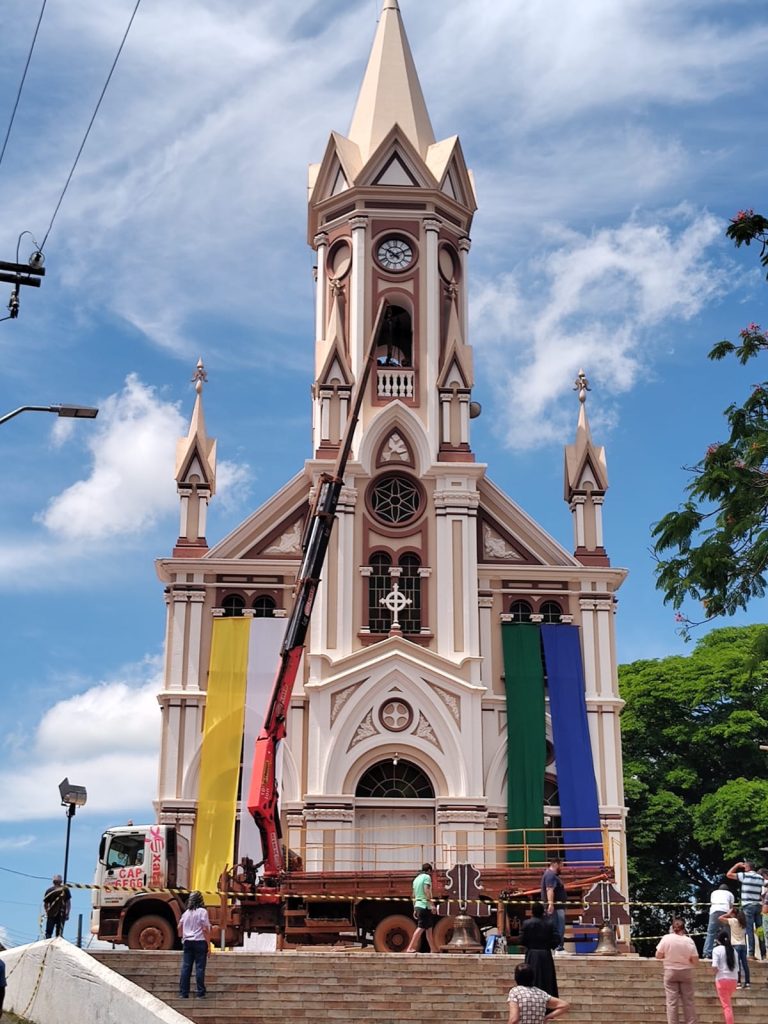 A princípio, durante a celebração da missa, Padre Ildeu reforçou a importância do ressoar dos sinos para a vida da comunidade, enaltecendo os aspectos da fé, da vida da Igreja e da união de esforços para que eles pudessem chegar novamente à torre da Matriz. Foram abençoados e ungidos com óleos os sinos, os quais agora receberam novos contrapesos, constituídos por madeiras restauradas dos antigos, bem como novas madeiras. Em seguida, os sinos foram conduzidos à entrada da igreja, onde foram alçados por caminhão munck até a torre. Os fiéis acompanharam toda a movimentação no adro da Igreja, podendo contemplar novamente os badalos dos três sinos agora batizados. Toda a estrutura de alvenaria já estava preparada para o recebimento dos sinos.