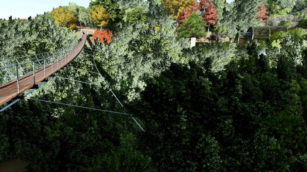 Em breve, será instalada a ponte pênsil que conectará dois decks em margens opostas da trilha, permitindo a travessia sobre o vale sem causar pisoteio em áreas úmidas e nas nascentes protegidas. O traçado em forma de ferradura acompanha a topografia para garantir acessibilidade e preservação das zonas sensíveis. A ponte também criará uma ligação direta com o anfiteatro do Museu de Congonhas, integrando o parque ao circuito cultural do entorno.
