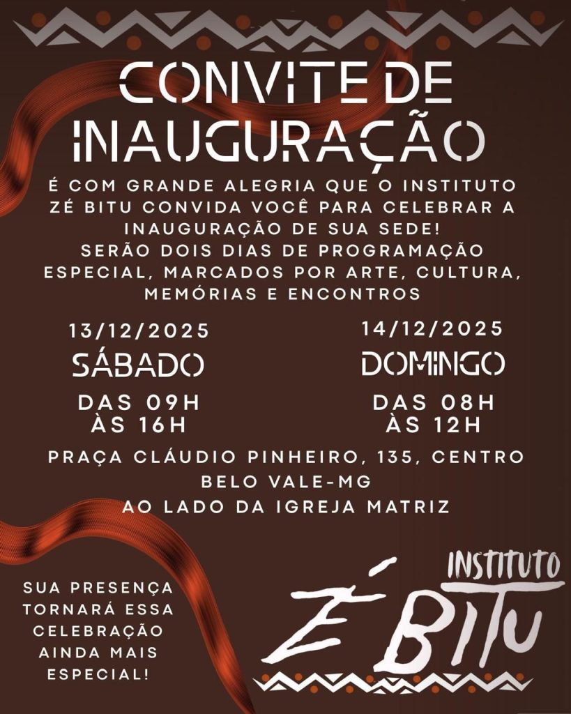 Belo Vale celebra a inauguração da sede do Instituto Zé Bitu, um espaço criado para fortalecer a arte, a cultura e as ações sociais no município e na região. Localizado ao lado da Igreja Matriz de Belo Vale, o instituto nasce como um local de acolhimento para a população belovalense, turistas e para as mais diversas manifestações artísticas e culturais, valorizando a riqueza e a diversidade cultural da cidade.
