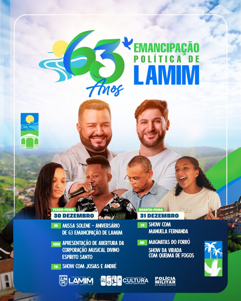 As comemorações dos 63 anos de Emancipação Política de Lamim são uma realização da Prefeitura de Lamim, por meio da Secretaria Municipal de Cultura, Esporte, Lazer e Turismo, com apoio da Polícia Militar de Minas Gerais, garantindo segurança e tranquilidade para todos. Será uma festa para celebrar o passado, viver o presente e brindar o futuro de uma cidade que segue crescendo com orgulho e união.