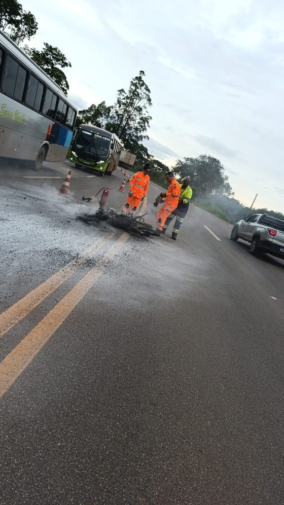 A manobra arriscada resultou em um acidente grave. Eles caíram na curva localizada perto da curva da Vila Marques. Após a queda, a situação se agravou rapidamente: a motocicleta que estava sendo empurrada incendiou-se. Em vez de lidarem com as chamas ou buscarem auxílio, os dois indivíduos fugiram imediatamente do local do acidente em um moto. Não há informações oficiais sobre feridos, nem se a Polícia Rodoviária Federal ou o Corpo de Bombeiros foram acionados para combater o incêndio e investigar a ocorrência, que levanta suspeitas devido à falta de placas nos veículos e à evasão rápida dos envolvidos. Equipes de socorro e PRF no local.