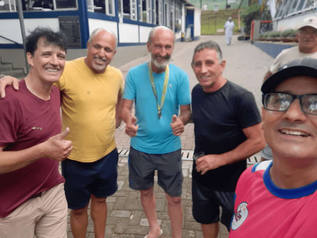Atletas do SuperAmigos na resenha comemorando o título de campeões. Da esquerda para direita( Magno,Mauro,Didi,Coelho e Edson)