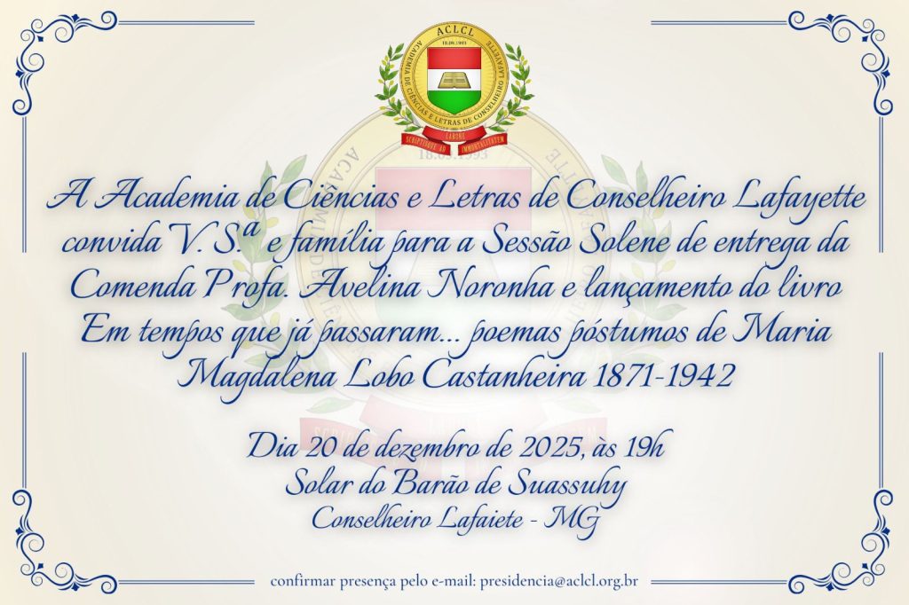 A Academia de Ciências e Letras de Conselheiro Lafayette tem a honra de convidar para a Cerimônia de Entrega da Comenda Profa. Avelina Maria Noronha de Almeida – 2025, a ser realizada no dia 20 de dezembro de 2025 (sexta-feira), às 19h, na sede da ACLCL.