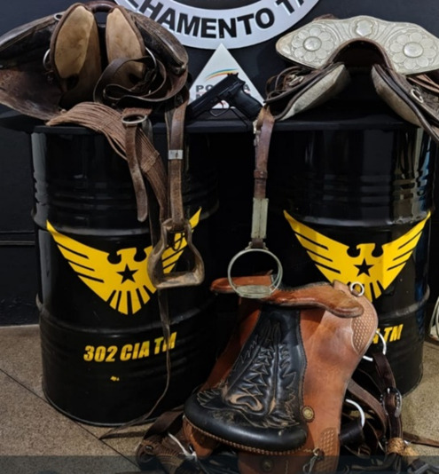 Devidamente autorizada, a Polícia Militar adentrou o local onde confirmou-se o fato, sendo recuperados 04 (quatro) motocicletas e 01 (um) veículo VW Saveiro, todos com registro de furto/roubo de um pátio credenciado para acautelamento de veículos, além de 03 (três) selas, 02 (dois) arreios e 01 (um) aparelho de ar-condicionado, também identificados como sendo produtos de furto.
